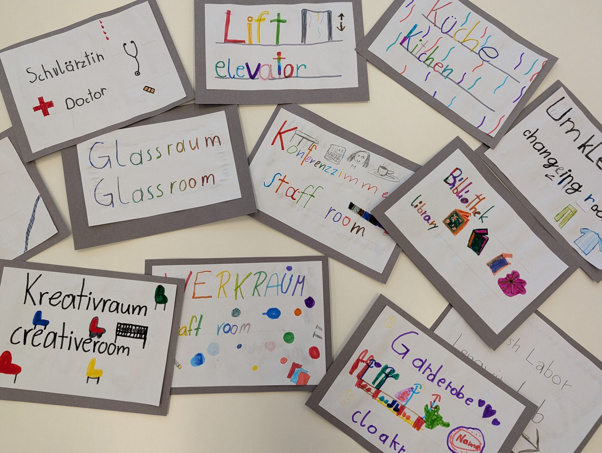 Die Kinder der 3a haben mit großer Begeisterung bilinguale (deutsch-englische) Schilder für unser Schulhaus gestaltet. Im Rahmen des Englischunterrichts wurden passende Begriffe gesammelt, übersetzt und kreativ umgesetzt. So finden sich nun im gesamten Schulgebäude liebevoll gestaltete Beschriftungen wie „Library – Bibliothek“ oder „Gym – Turnsaal“.
