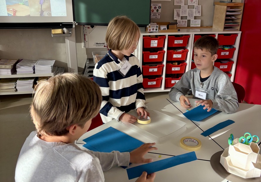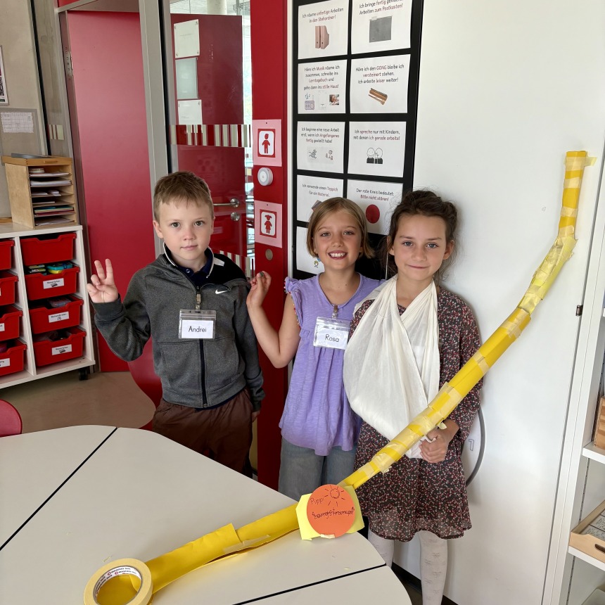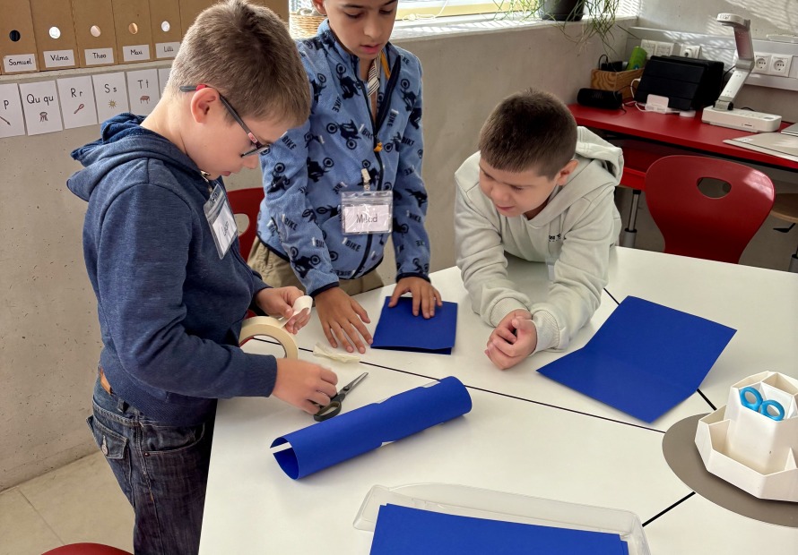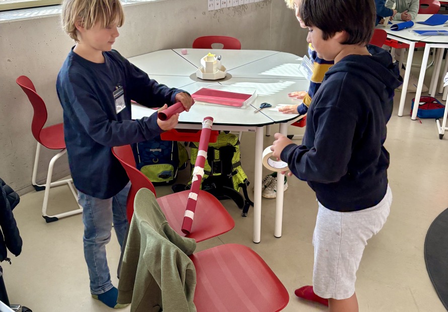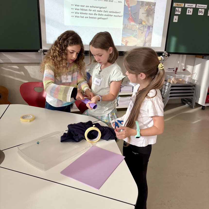 Die Kinder der 3b hatten am ersten Schultag die Aufgabe in Kleingruppen mit 8 Blättern Papier, Klebeband, Schere und einer Murmel im Team eine funktionierende Murmelbahn mit einem Höhenunterschied von 50 cm zu bauen.