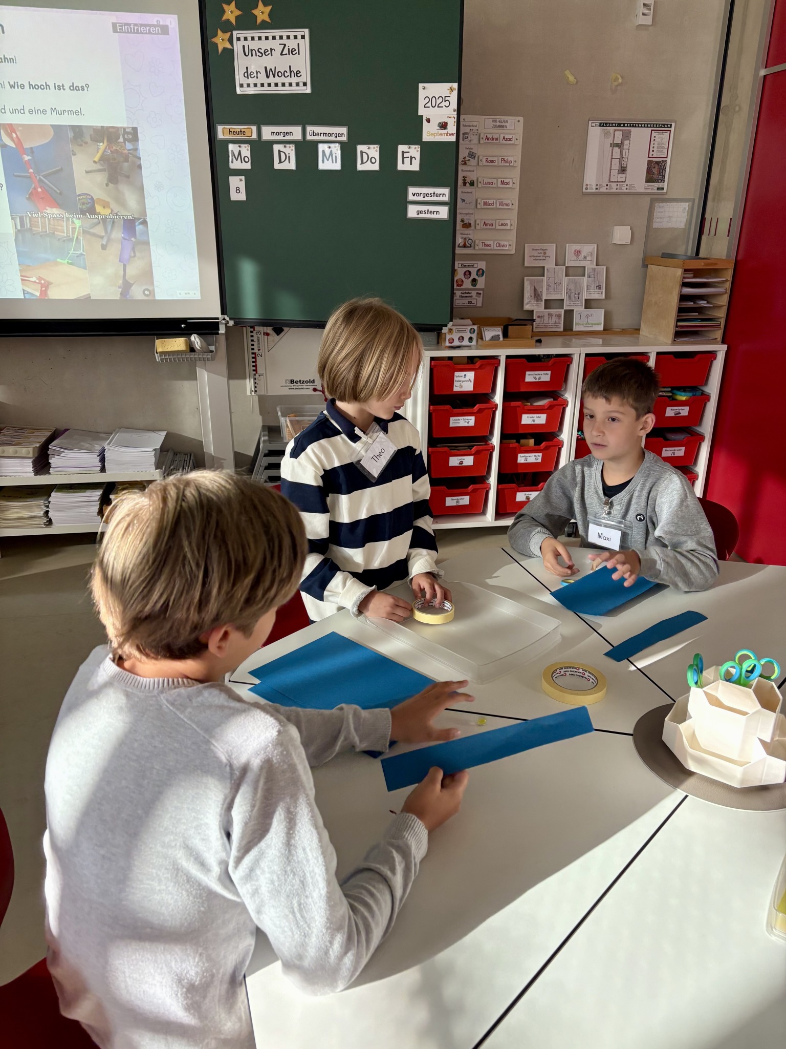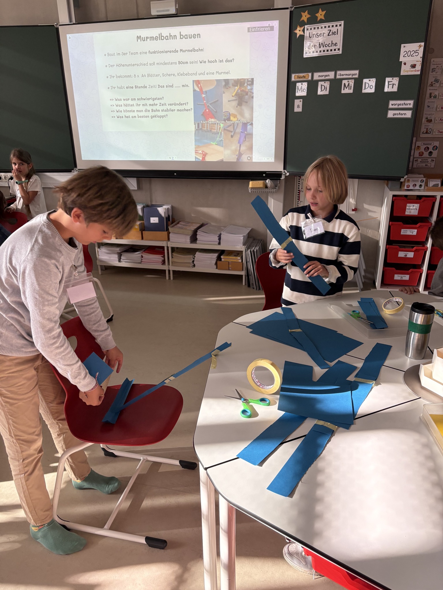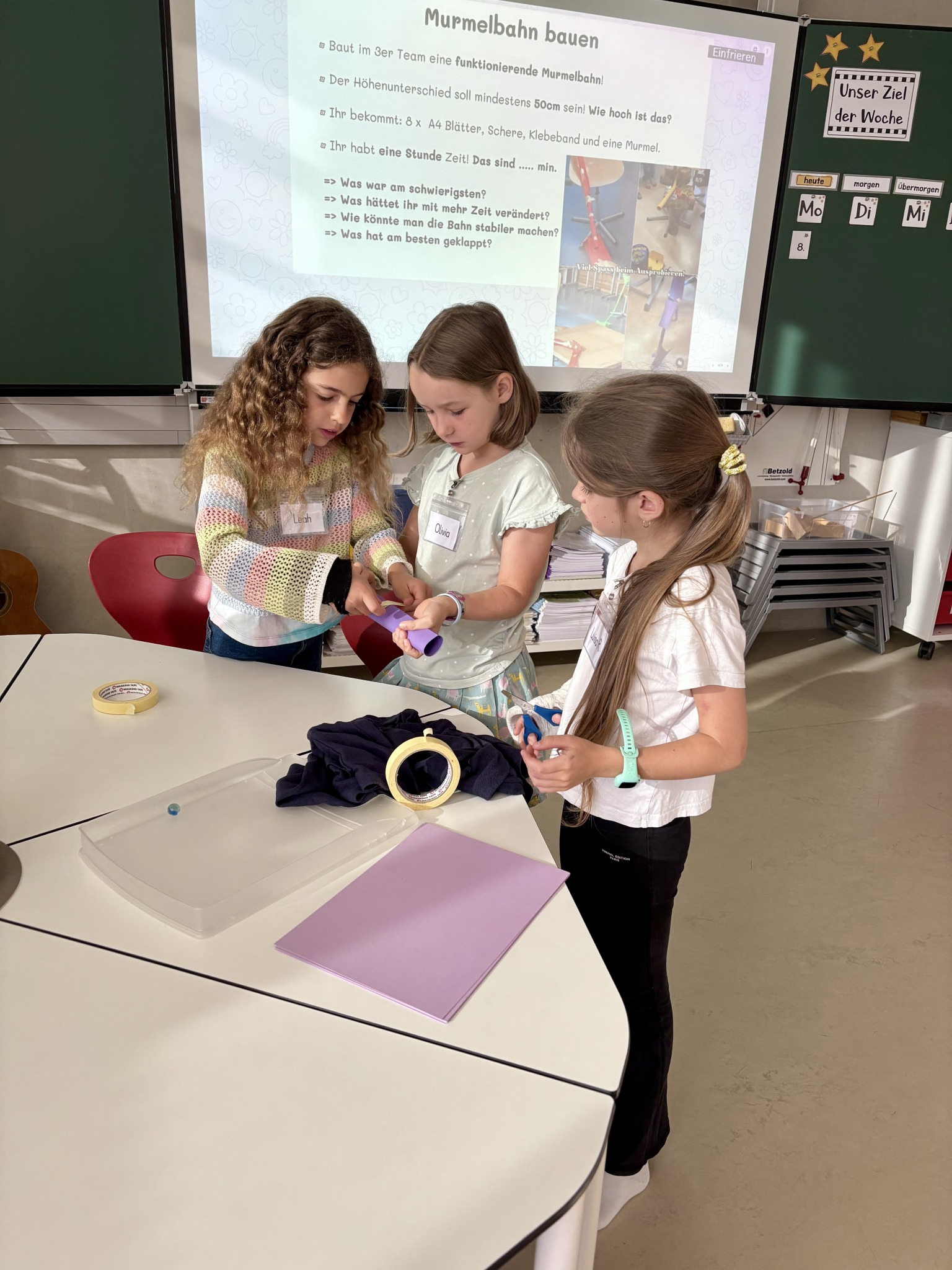 Die Kinder der 3b hatten am ersten Schultag die Aufgabe in Kleingruppen mit 8 Blättern Papier, Klebeband, Schere und einer Murmel im Team eine funktionierende Murmelbahn mit einem Höhenunterschied von 50 cm zu bauen.