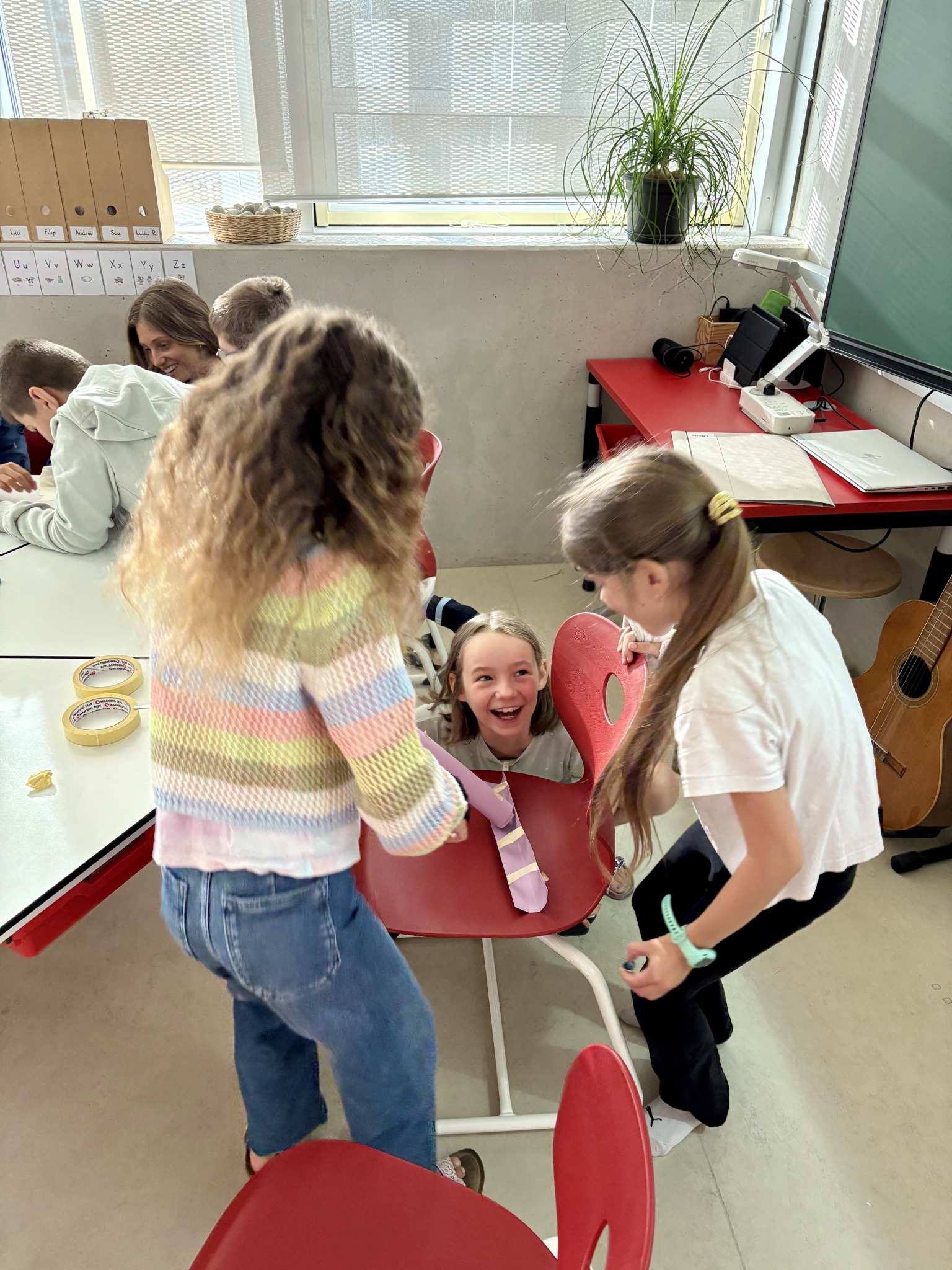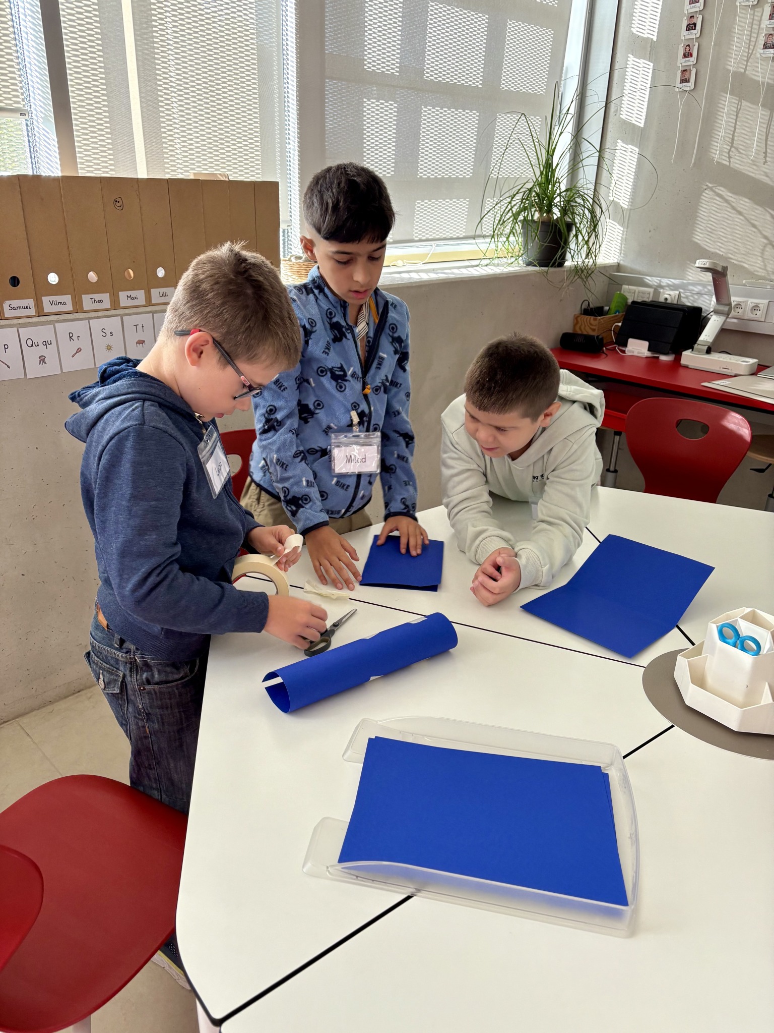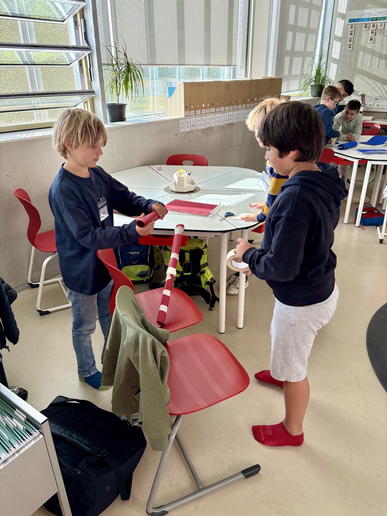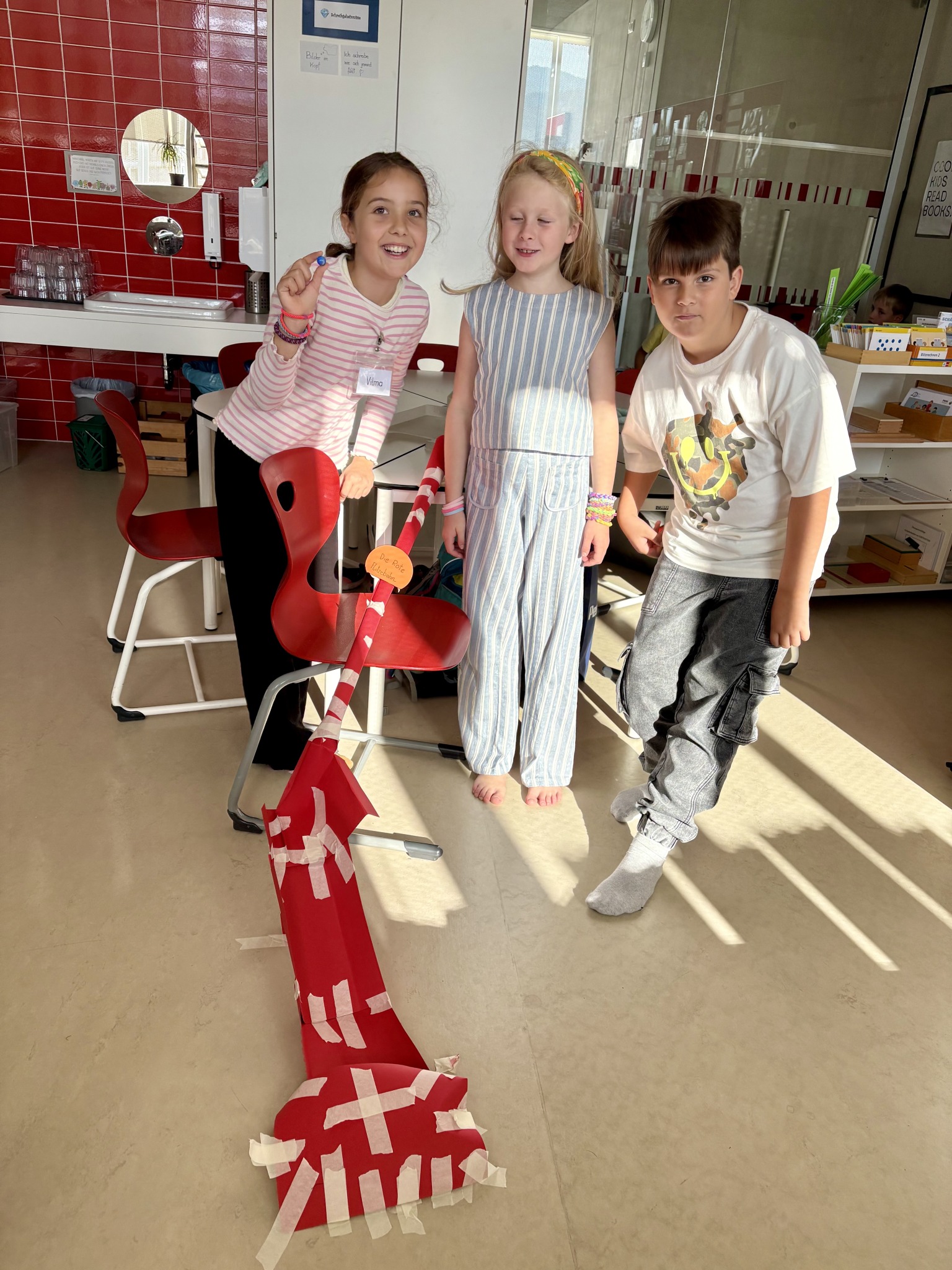 Die Kinder der 3b hatten am ersten Schultag die Aufgabe in Kleingruppen mit 8 Blättern Papier, Klebeband, Schere und einer Murmel im Team eine funktionierende Murmelbahn mit einem Höhenunterschied von 50 cm zu bauen.