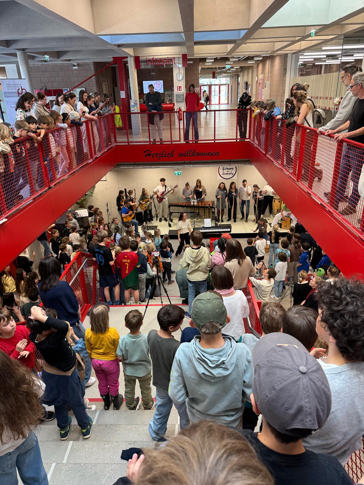 Highlight des Tages war das große Mittagskonzert. Die Kinder der PVS, Studierende der PH Salzburg und Gaststudierende aus Italien, Frankreich und Estland gestalteten ein lautstarkes, emotionales, bewegendes – allenfalls großartiges Konzert, bei dem kein Bein stillhalten konnte.