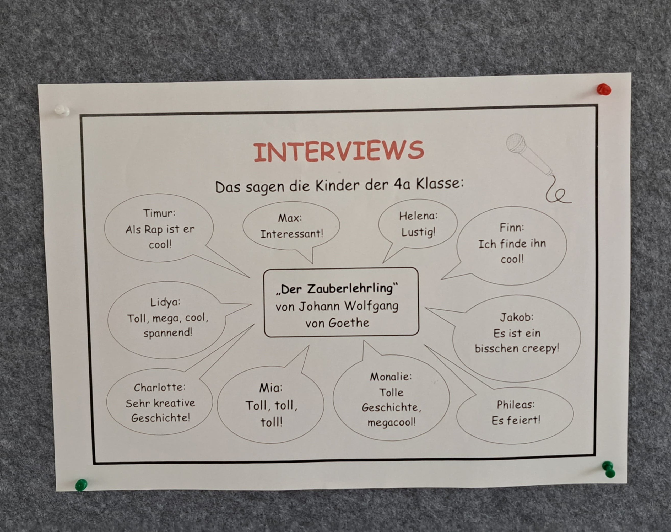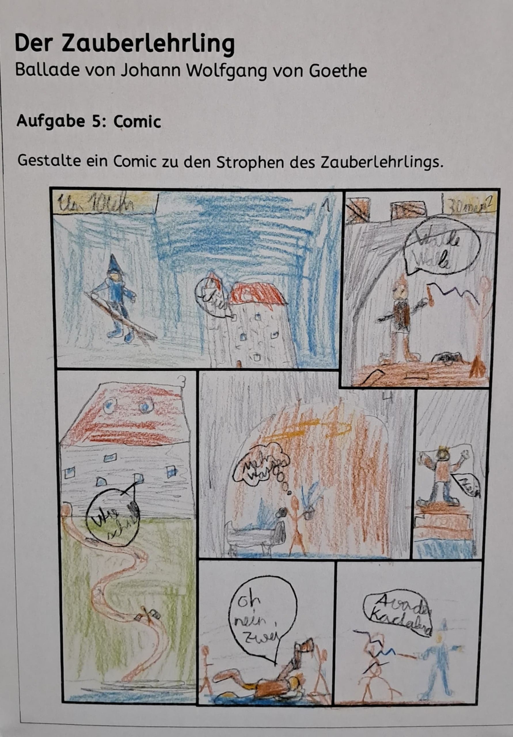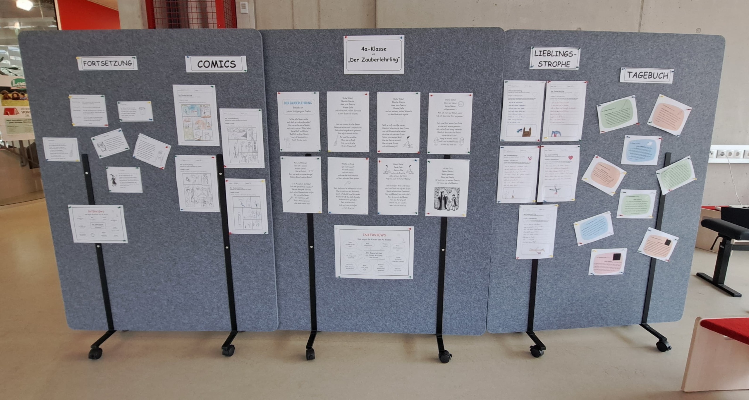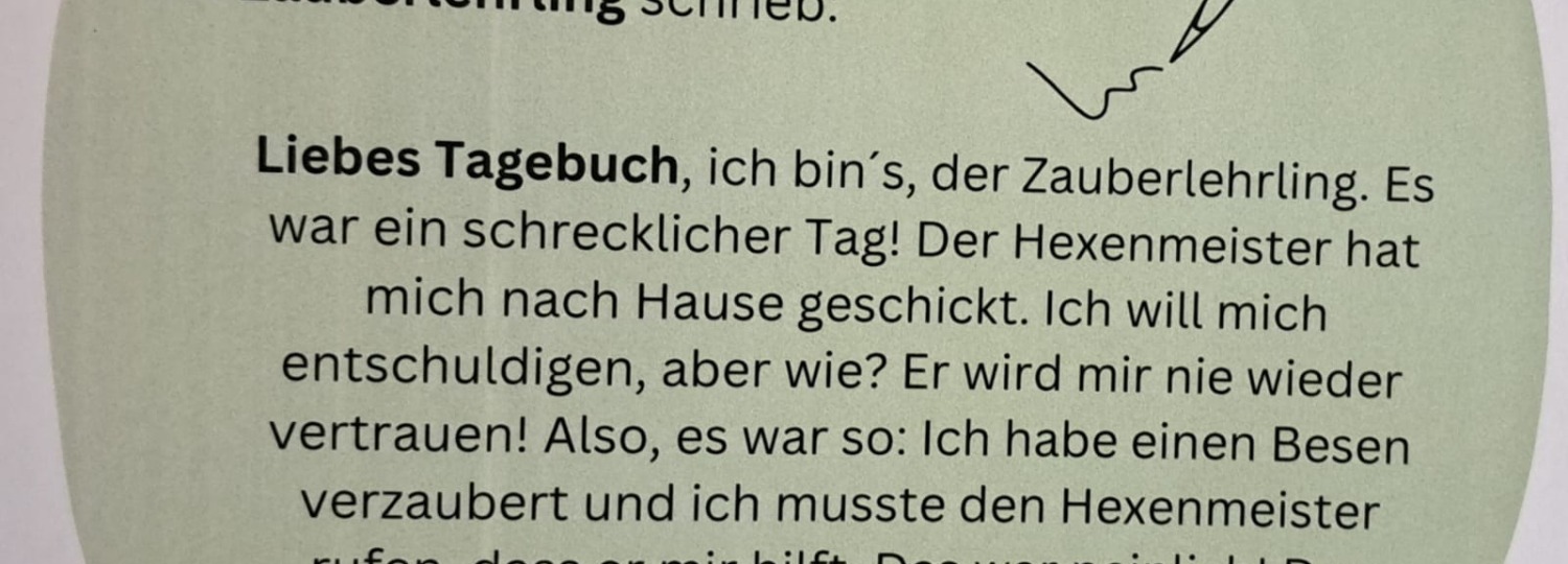 Dabei wurde der Zauberlehrling gelesen, gerappt und auf unterschiedliche textproduktive Arten bearbeitet. So konnten die Schüler*innen aus unterschiedlichen Aufgabenstellungen wählen: Fortsetzung schreiben, Comic zeichnen, Tagebucheintrag verfassen, Interviews durchführen, Gefühlsverlauf des Zauberlehrlings nachvollziehen, die Lieblingsstrophe abschreiben, ein Rätsel bearbeiten etc. Die Ergebnisse wurden gesammelt und in einer Ausstellung im Schulhaus veröffentlicht.