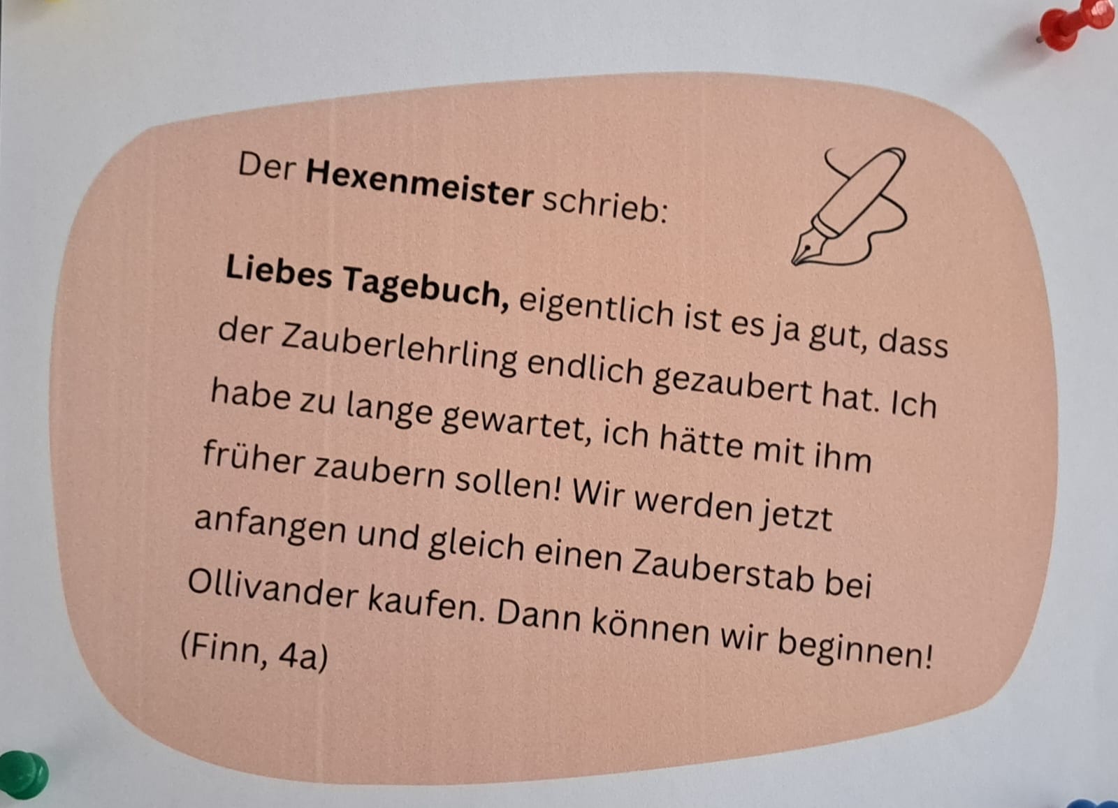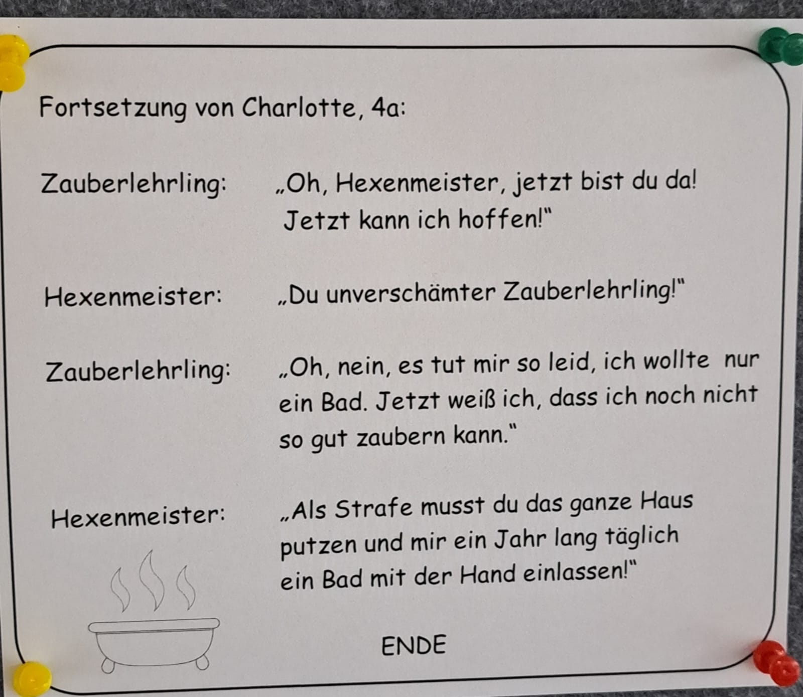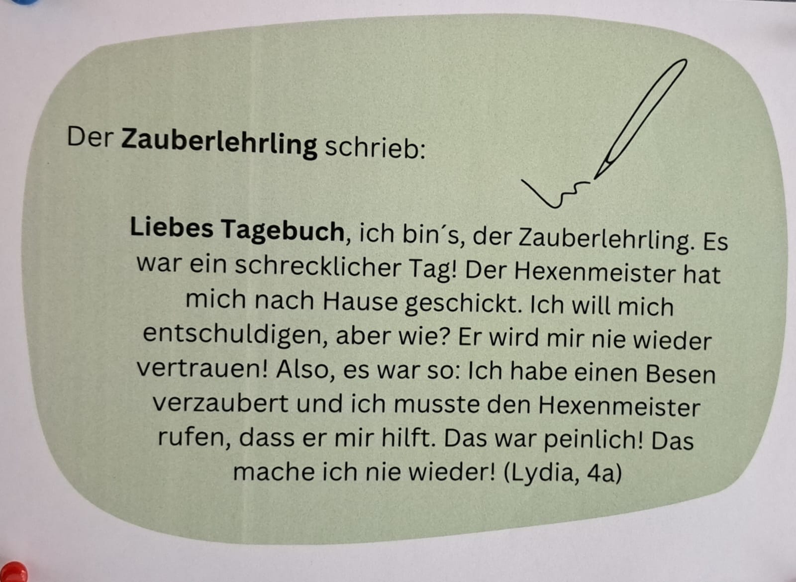 Dabei wurde der Zauberlehrling gelesen, gerappt und auf unterschiedliche textproduktive Arten bearbeitet. So konnten die Schüler*innen aus unterschiedlichen Aufgabenstellungen wählen: Fortsetzung schreiben, Comic zeichnen, Tagebucheintrag verfassen, Interviews durchführen, Gefühlsverlauf des Zauberlehrlings nachvollziehen, die Lieblingsstrophe abschreiben, ein Rätsel bearbeiten etc. Die Ergebnisse wurden gesammelt und in einer Ausstellung im Schulhaus veröffentlicht.