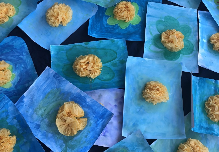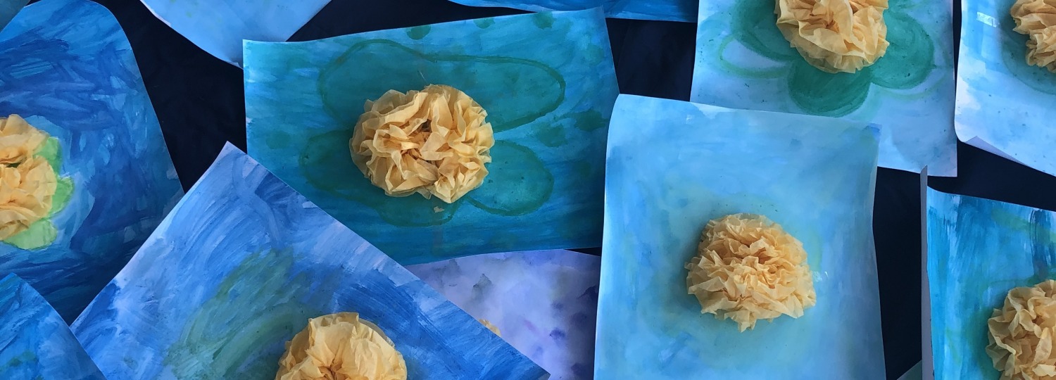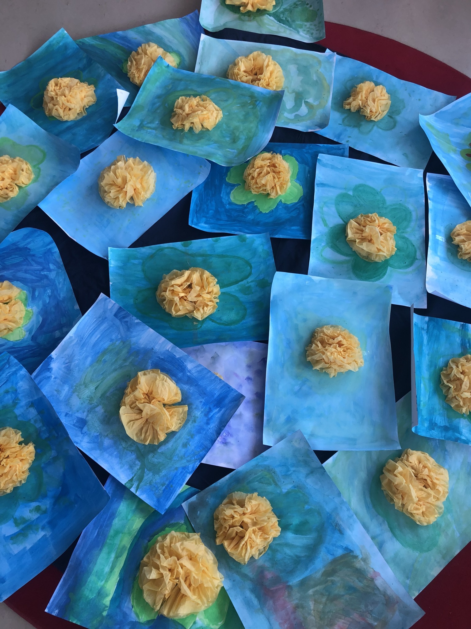 Eine Phantasiereise regt die Sinne an und danach gestalten die Kinder eine Seerose aus Papier, die im Wasser zum Blühen gebracht wird. Wer war Monet und wie verlief sein Leben als Künstler? Diese Fragen wurden im Anschluss geklärt. So sieht er also aus und das war sein Leben. Echte Seerosen haben wir keine im Klassenzimmer, also stellen wir uns welche aus Servietten her! Die Hintergründe werden mit Wasserfarben gemalt und aus Blau- und Grüntönen gemischt. Wenn wir alle zusammenhelfen können wir einen Teich bauen. Oh, wie schön!